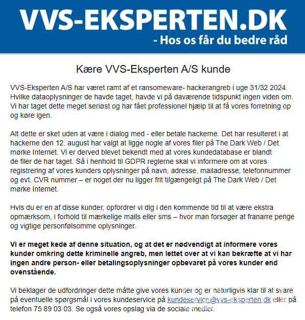 - VVS-Eksperten har sendt en mail til tidligere kunder om ransomware angreb i uge 31/32