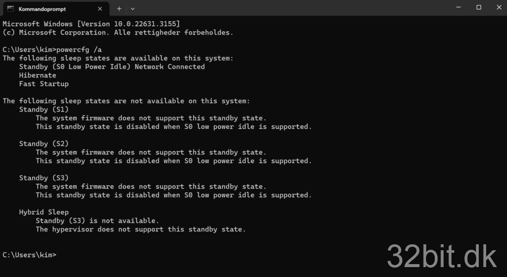 Hvis du ikke har en Legion-bærbar, fortvivl ikke. Der er stadig en vej frem. Start med at åbne en kommandoprompt i Windows og indtast kommandoen “powercfg /a” for at få en liste over understøttede strømtilstande. I nogle tilfælde vil du muligvis kun se S0-søvn tilgængelig, men du kan ændre dette gennem software, der følger med din computer, eller ved at justere BIOS-indstillingerne.